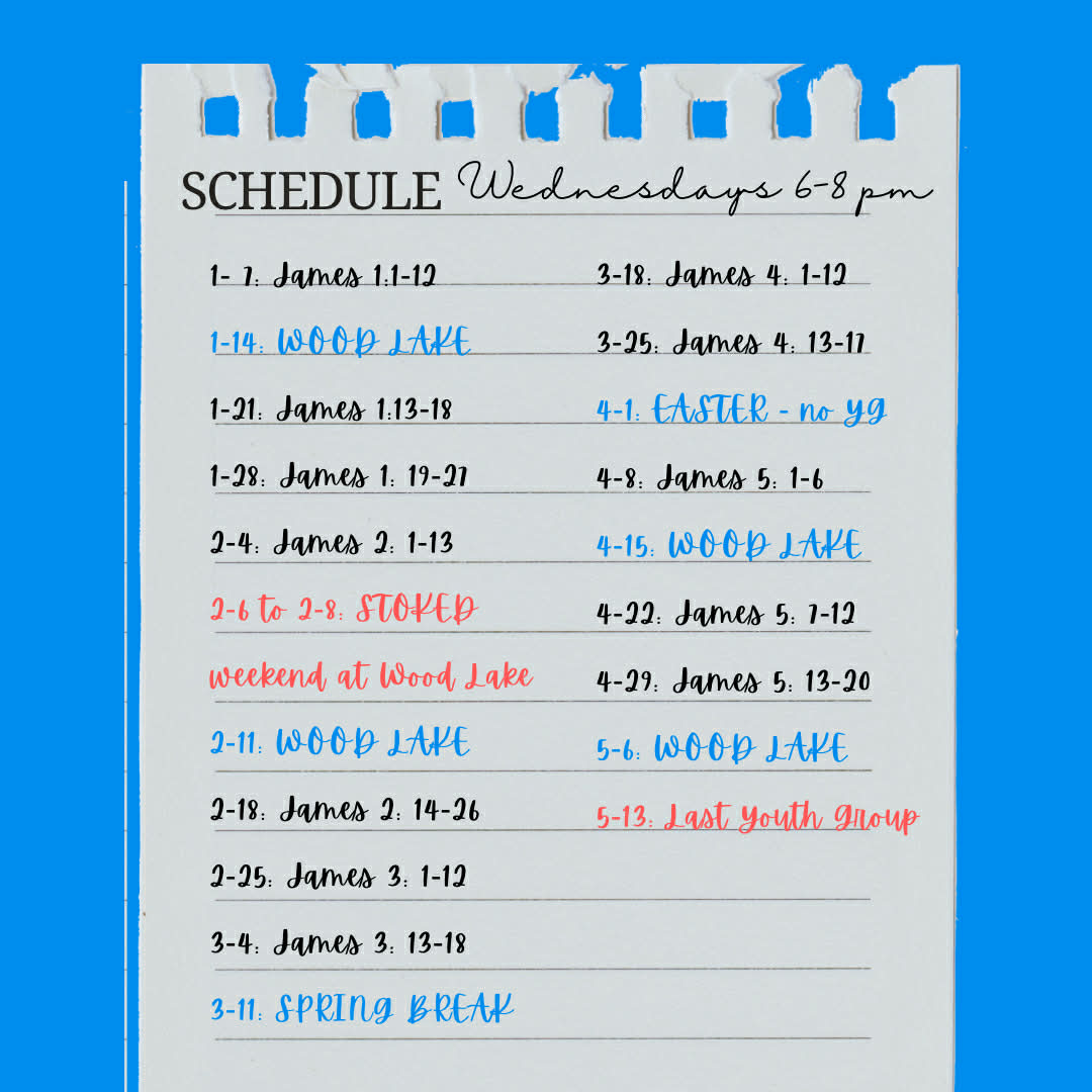 Youth group is held Wednesdays 6:00 p.m. – 8:00 p.m. at the church. Grades 6-12. Ignite Youth Group encourages students to worship the Lord in all they do, walk out their purpose in life, welcome one another in love, grow in Godly wisdom, and be a witness to their communities. Our Winter/Spring Schedule is below. Bring a friend!