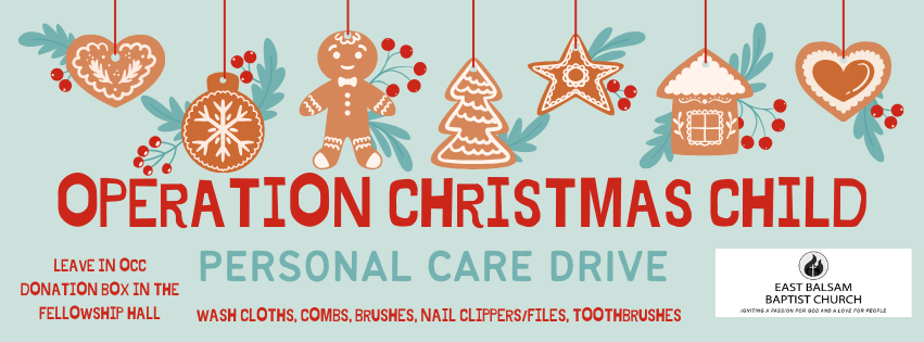 We are currently holding a PERSONAL CARE DRIVE for OPERATION CHRISTMAS CHILD. We will update the drive as we change to focus on certain items throughout the year. Items that can be donated are washcloths, combs, brushes, nail clippers/files and toothbrushes. Donated items may be left by the OCC display in the fellowship area. We will accept any of your donations anytime throughout the year!
